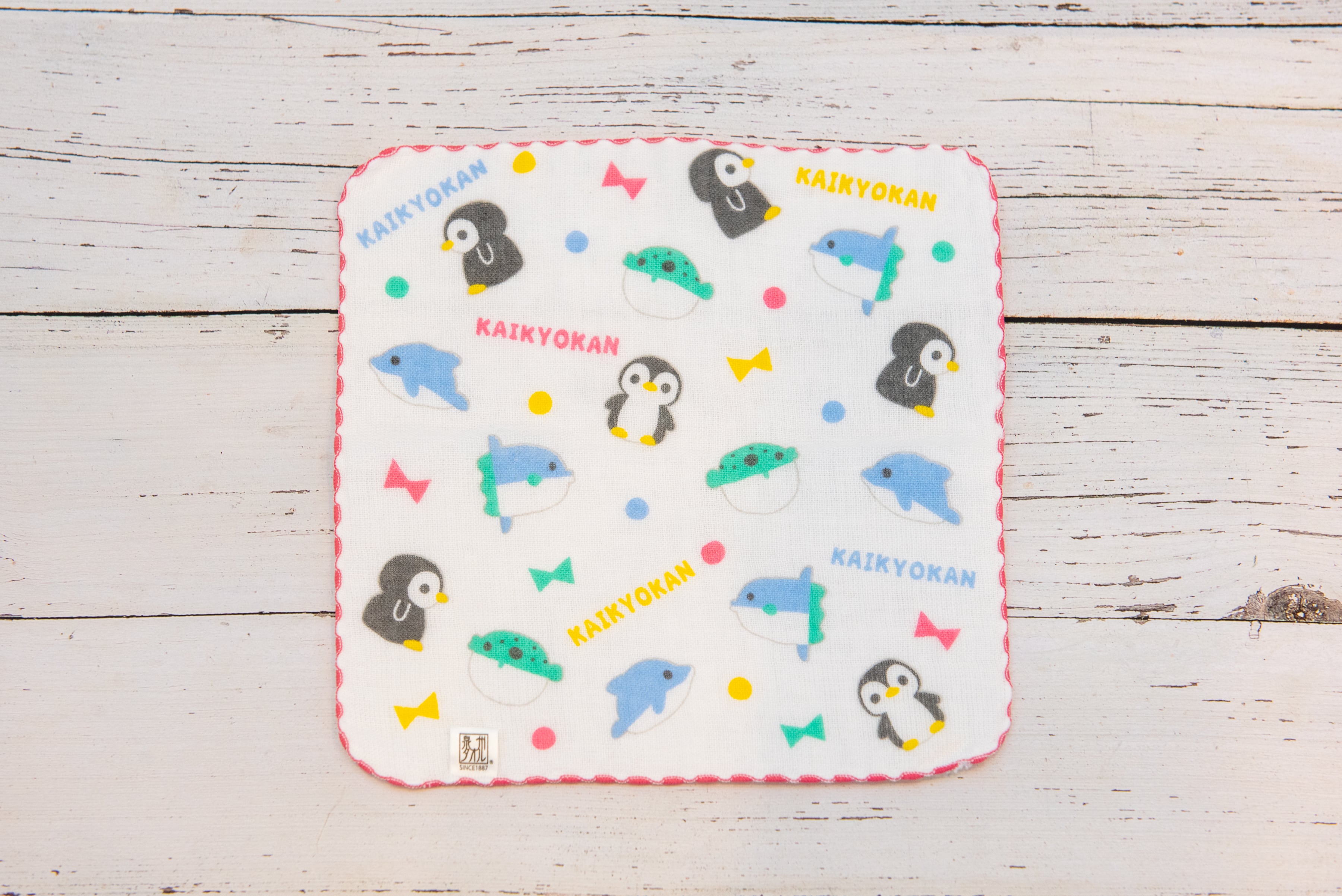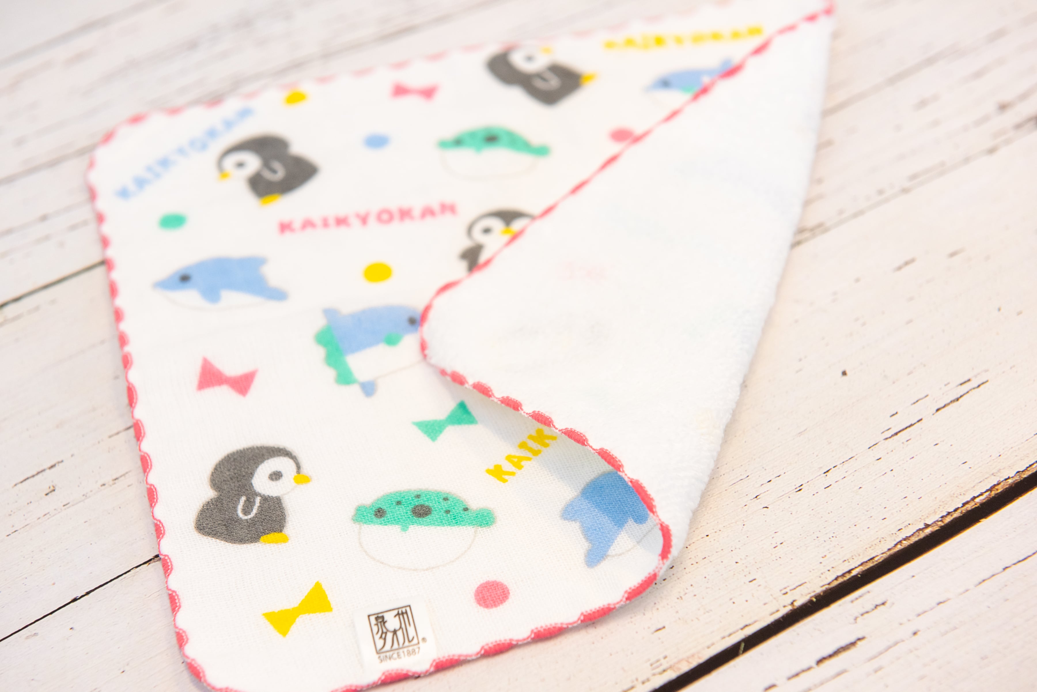 海響館オリジナルのベビースタイとガーゼタオルのセット。